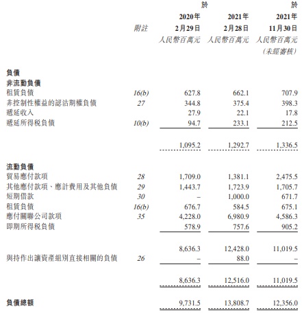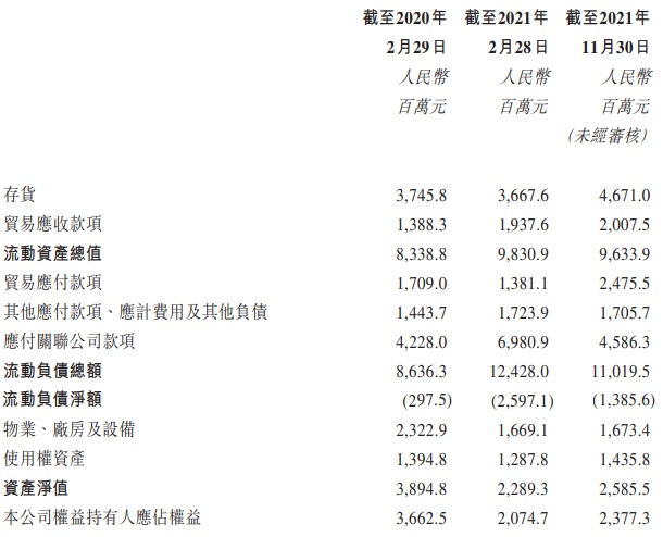 公司的流动负债净额由截至2021年2月28日的人民币25.97亿元减少46.6%至截至2021年11月30日的13.86亿元,主要由于应付关联公司款项减少23.95亿元,是由于公司结算应付先前向百丽国际宣派的股息。