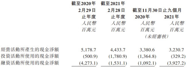 截至2020年2月29日止年度、截至2021年2月28日止年度、截至2021年11月30日止九个月,百丽时尚的收入分别为201.14亿元、217.37亿元和176.27亿元,净利润分别为16.65亿元、26.16亿元和22.97亿元,经营活动所产生的现金净额分别为51.79亿元、44.34亿元、32.31亿元。