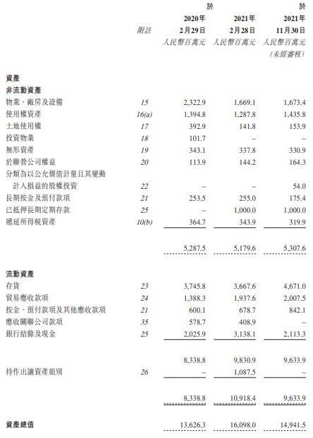 截至2020年2月29日、2021年2月28日、2021年11月30日,百丽时尚资产总值分别为136.26亿元、160.98亿元、149.42亿元,其中流动资产分别为83.39亿元、98.31亿元、96.34亿元。