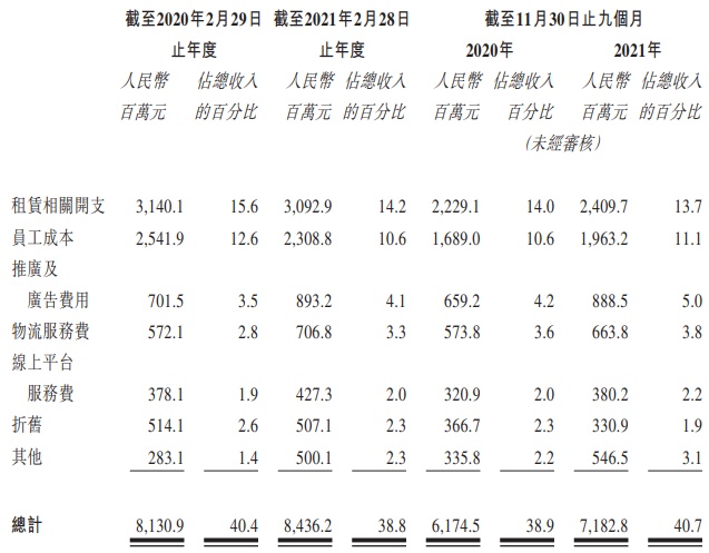 截至2020年2月29日及2021年2月28日止年度以及截至2021年11月30日止九个 月,百丽时尚的销售及营销开支分别为81.31亿元、84.36亿元及71.83亿元,占各期间收入的40.4%、38.8%及40.7%。