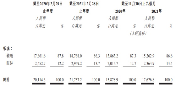 鞋履收入占百丽时尚收入的86%以上。截至2020年2月29日止年度、截至2021年2月28日止年度、截至2021年11月30日止九个月,鞋履收入占百丽收入的比例分别达87.8%、86.3%、86.6%,服装收入占比分别为12.2%、13.7%、13.4%。