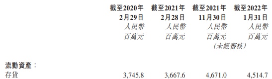 截至2020年2月29日、2021年2月28日、截至2022年1月31日,百丽时尚的存货分别为37.46亿元、36.68亿元、45.15亿元。