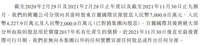 2年零9个月时间,百丽时尚合计向百丽国际派息132.28亿元。截至2020年2月29日及2021年2月28日止年度以及截至2021年11月30日止九个月,百丽时尚的附属公司分别向其当时股东百丽国际宣派股息70亿元、42.28亿元及20亿元(已对销集团内股息),百丽国际其后将绝大部分所收取的股息用于偿还2017年私有化产生的债务。