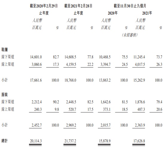 截至2020年2月29日及2021年2月28日止年度以及截至2021年11月30日止九个月,百丽时尚来自线下销售渠道的收益分别为人168.13亿元、170.57亿元及131.22亿元,分别占各期间总收益的83.6%、78.5%及74.4%。
