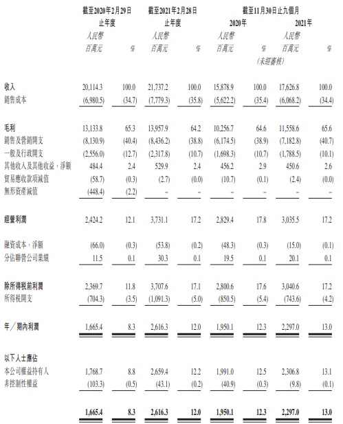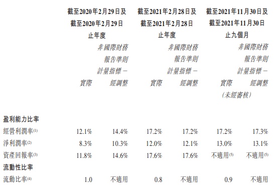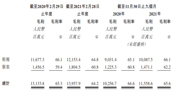 截至2020年2月29日止年度、2021年2月28日止年度、截至2021年11月30日止九个月,百丽时尚的毛利率分别为65.3%、64.2%、65.6%,净利润率分别为8.3%、12.0%、13.0%,经调整净利润率分别为10.3%、12.1%、13.1%。