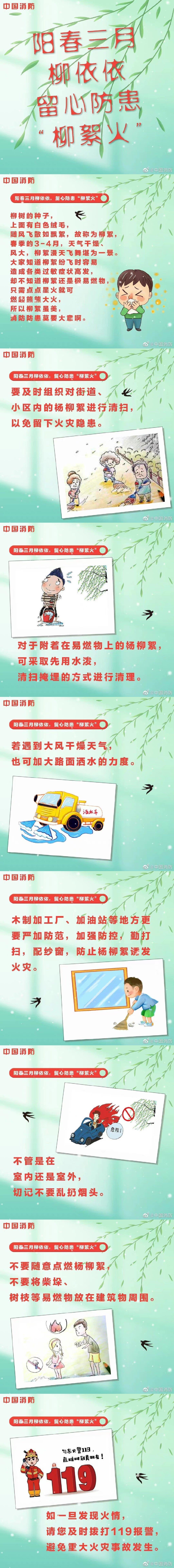 4月7日,武进高新北区大通河边柳絮着火;4月10日,新北凤凰名城附近柳絮着火;4月10日,新北区一加油站附近绿化带内柳絮着火;4月11日,天宁区一工厂空地上柳絮着火,并引燃枯木树枝。