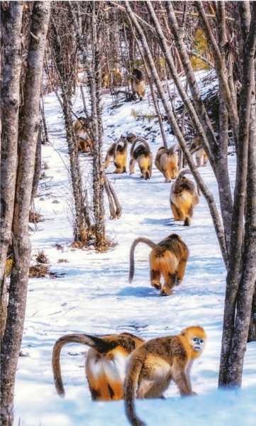 2015年,一次偶然的机会,杜枫邂逅了神农架国家公园保护基地里的金丝猴。“树林里,几只金色精灵跳来蹿去,小猴肉嘟嘟,大猴的毛发又长又美,脸孔呈现淡蓝色。”一见它们,杜枫的心就沦陷了。尽管已经60岁,她仍然背着沉重的摄影包,不顾山路难走,每年多次前往神农架,追逐金丝猴灵动的身影。