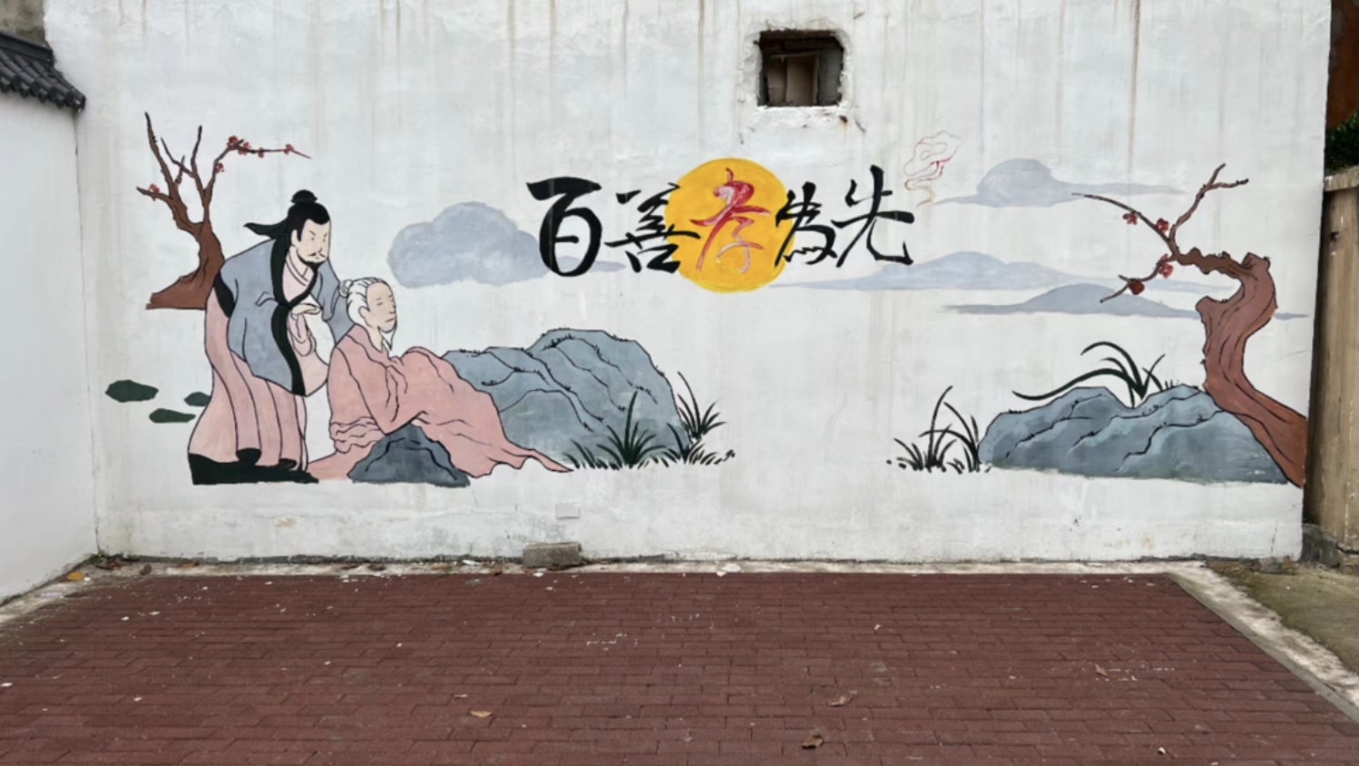 “慈孝”主题背景墙,是不少居民驻足的地方。记者冷靖华 摄