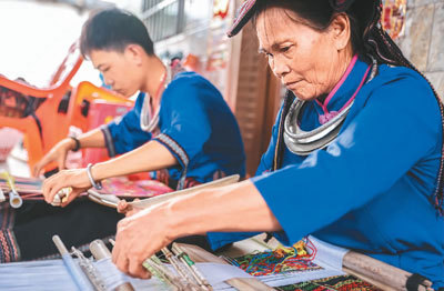 在贵州黔东南苗族侗族自治州,各族非遗传承人群大大受益于非遗研培计划、传统工艺工作站和非遗扶贫工坊。如苗族蜡染传承人杨秀芳2016年到清华大学非遗研修班学习。学成归来后,她开拓了眼界,提升了文化自信,在大山深处组织苗寨妇女从事手工艺生产,她的女儿还将销售门店开到了丹寨县。