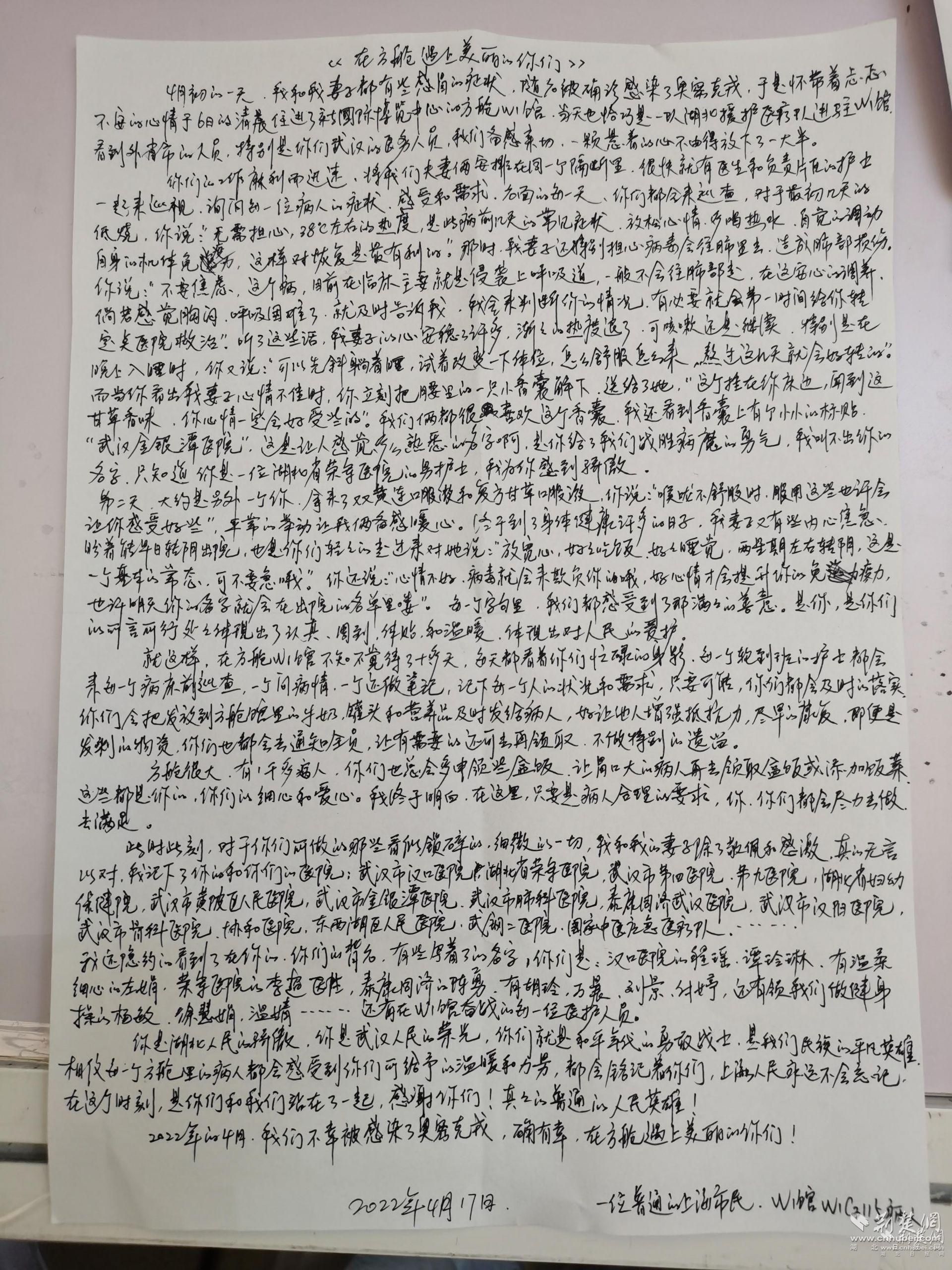 荆楚网(湖北日报网)讯(记者肖慧婷 通讯员孙四海)“你是湖北人民的骄傲,是和平年代的勇敢战士,相信每一个方舱里的病人都会感受到你们给予的温暖和力量,都会铭记着你们……”4月18日,在上海新国际博览中心方舱W1馆工作的湖北援沪医疗队,收到了一封患者手写的感谢信。