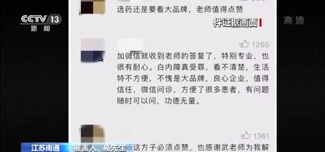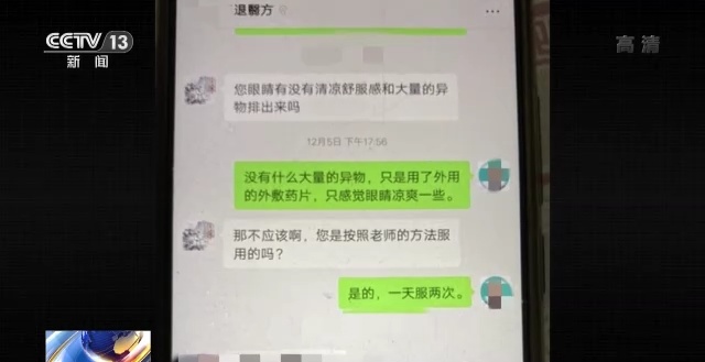 当事人 葛先生:我想他们老中医说的这么好,我还是能接受的,我想对我的眼睛肯定有帮助的,我看既然这么神奇,他为什么放到微信上推销,而不放到大药店里或者医院里的,也有这个想法,后来他又把我们拉进一个群,好多人患者告诉我这款药很好,然后我就相信了。