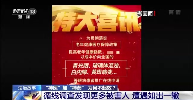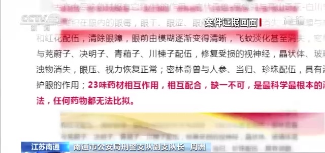 南通市公安局刑警支队副支队长 周洲:就是说你不管是什么样的眼疾,青光眼、老花眼或者什么样的疾病,他提供老中医老专家名号来推荐一种药材给你,实际上也不是药,有的只是一种饮用品或者饮料来诈骗。治疗眼疾的时候,他们主要采用的是千病一方、千病一药做法。