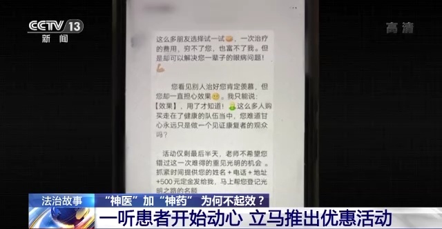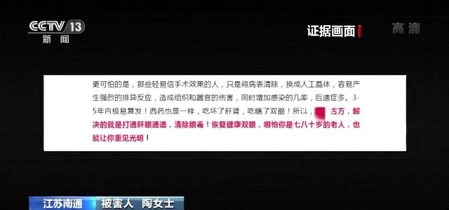 有这样一款药,宣称能让广大中老年人,在不戴老花镜的情况下,到了60岁能穿针引线,70岁能读书看报,甚至80岁、90岁还能耳聪目明。这是江苏南通的陶女士在一个网络公众号上看到的内容。文章的作者是一位自称有着四十年从医经历、还说自己是专门治疗眼疾的老中医。那么,这名所谓的"神医"究竟有什么过人的医术呢?