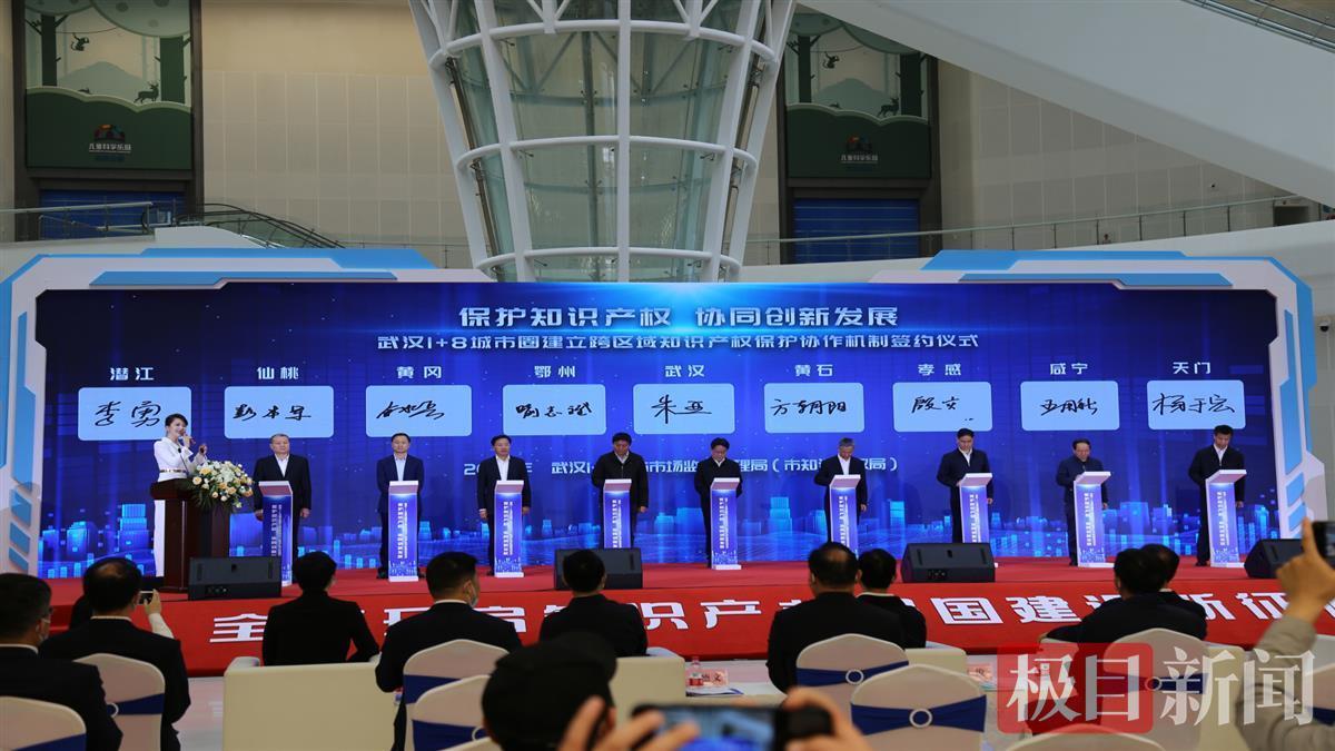 活动现场,武汉“1+8城市圈”九个城市知识产权局局长同台签约跨区域知识产权保护协议。国家知识产权局专利局审查协作湖北中心侯海薏主任向该中心知识产权服务湖北高质量发展博士团授旗。省市场监督管理局局长刘荣山、省知识产权局局长周德文为湖北省第二届专利大赛金奖21家单位代表颁奖。