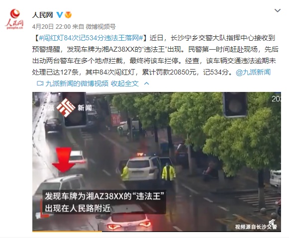 近日,长沙宁乡交警大队指挥中心接收到预警提醒,发现车牌为湘AZ38XX的“违法王”出现。民警第一时间赶赴现场,先后出动两台警车在多个地点拦截,最终将该车拦停。经查,该车辆交通违法逾期未处理已达127条,其中84次闯红灯,累计罚款20850元,记534分。