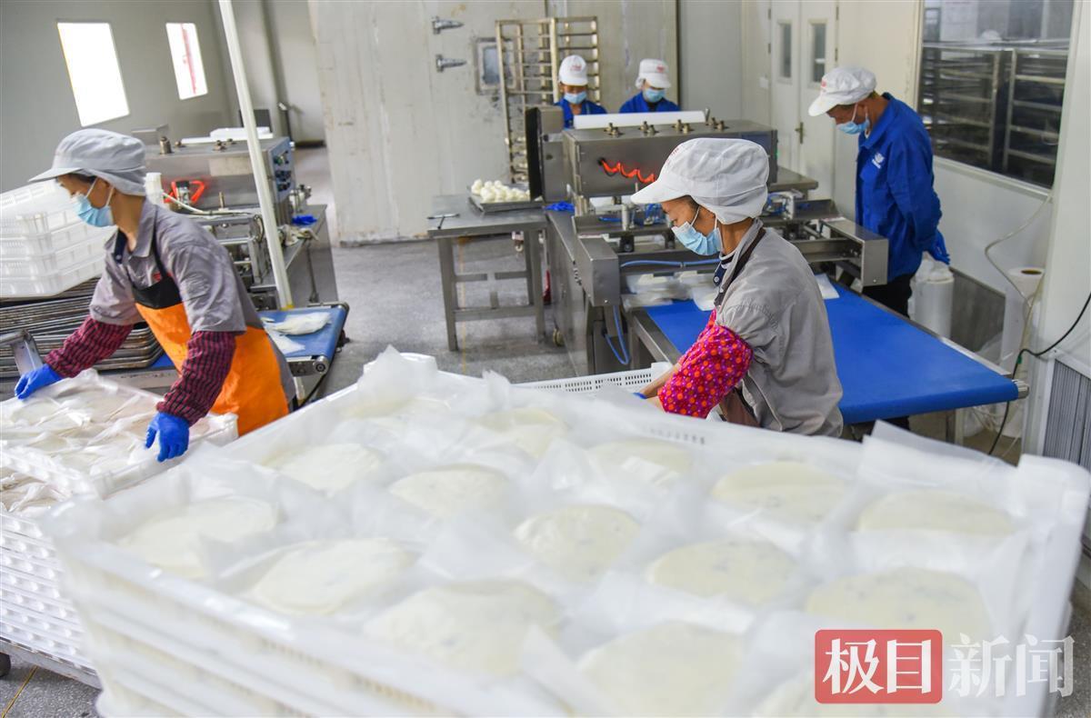 4月12日,极目新闻记者在荆州市宇翔食品股份有限公司生产车间看到,在自动化生产线前,生产铁牛饼的原材料经过搅料、和面、上机、注馅、成型等半个小时的流水线工序后,再经过约一天时间的自然晾干就可完成打包出货。