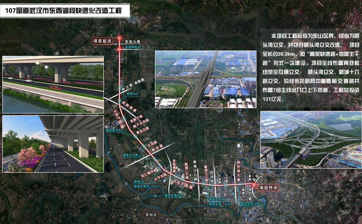 G107武汉市东西湖段(高桥二头至额头湾)快速化改造提升工程起于G107高桥二路,止于额头湾立交西侧,为城市快速路兼一级公路,道路全长约10.375公里,项目投资72.24亿元。采用高架+地面形式,其中高架桥全长约9.125公里,地面道路全长约10.375公里。预计2025年建成通车。