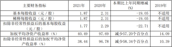 2021年,诺唯赞基本每股收益为1.87元/股,同比减少19.05%;加权平均净资产收益率为40.49%,比上年同期减少57.20个百分点;扣除非经常性损益后的加权平均净资产收益率为38.44%,比上年同期减少58.34个百分点。