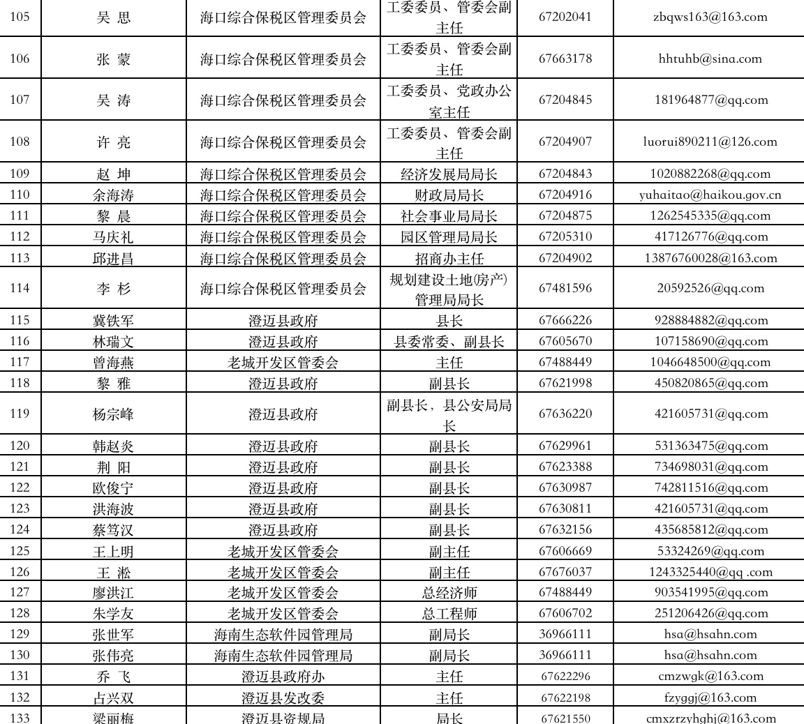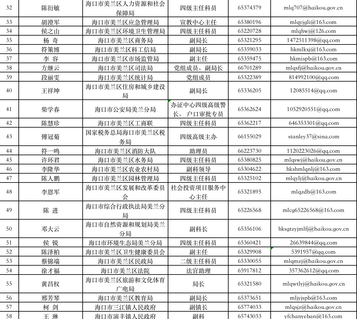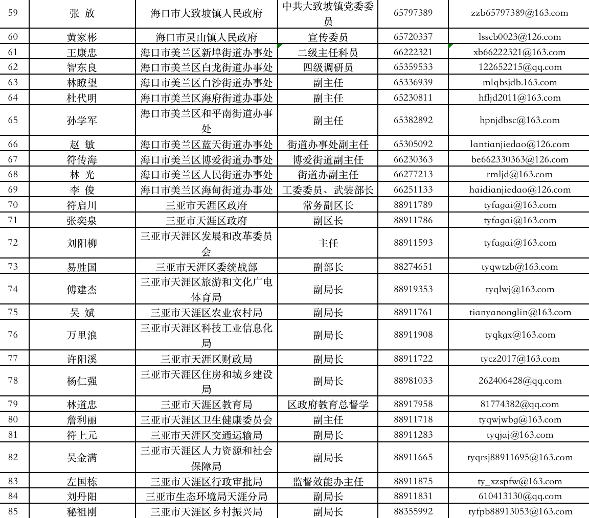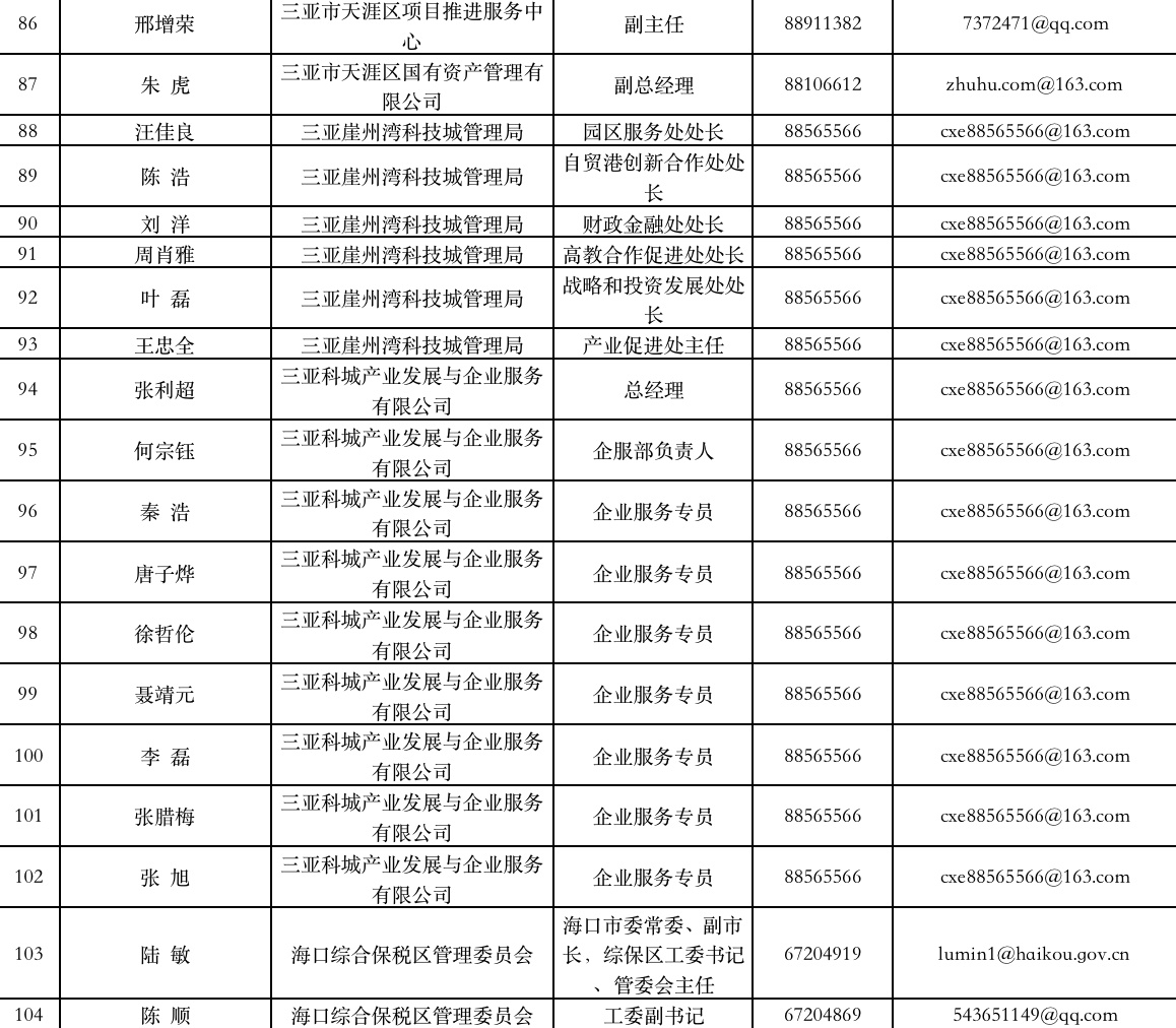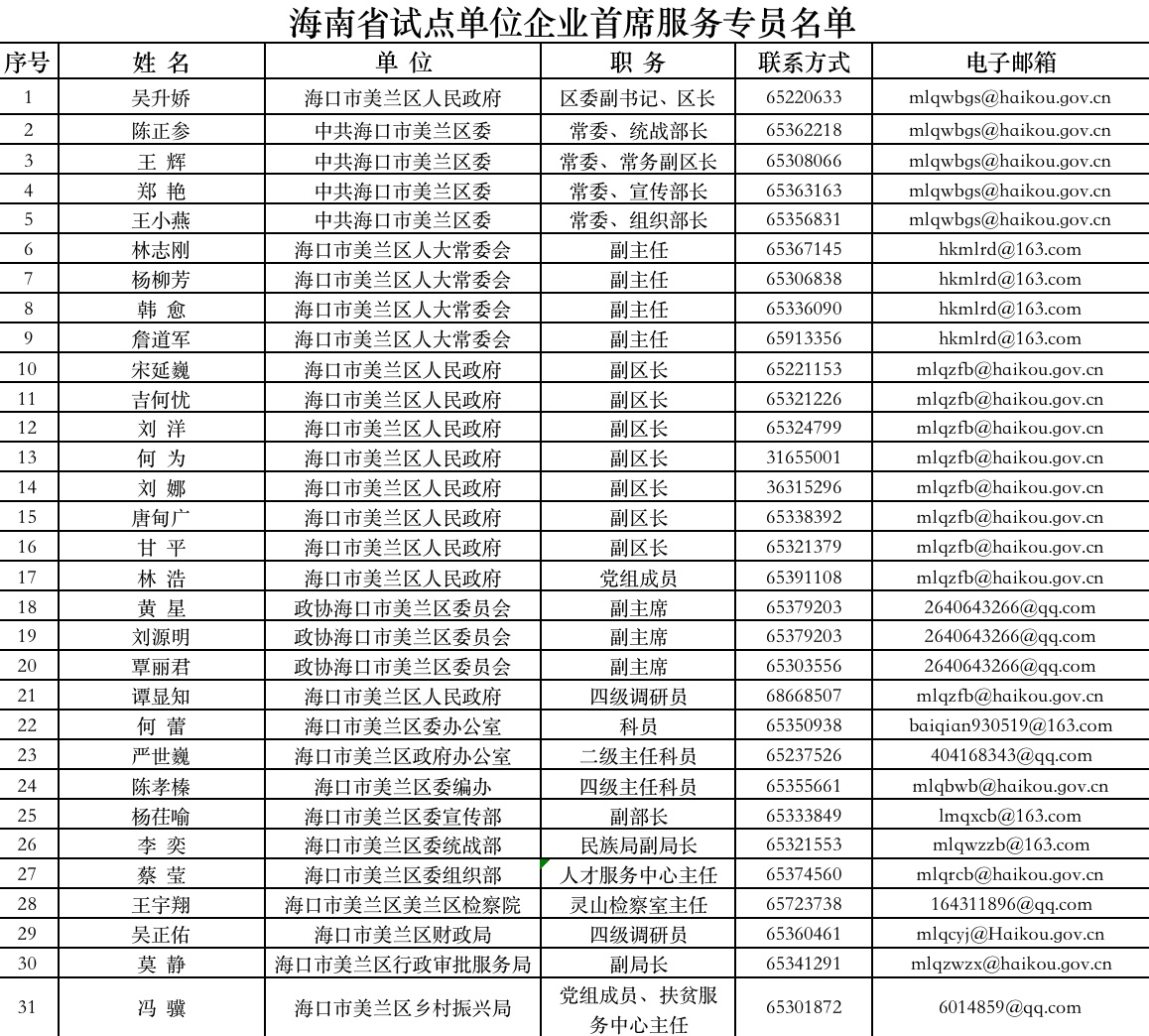 新海南客户端、南海网、南国都市报4月23日消息(记者 谭琦 通讯员 庄蕾蕾 陈宇超)日前,海南省优化营商环境工作专班办公室公布一批企业首席服务专员名单及联系方式。据悉,海南在海口市美兰区、海口综合保税区、三亚市天涯区、三亚崖州湾科技城、澄迈县启动企业首席服务专员制度试点工作,企业遇到难题可直接向其反映。