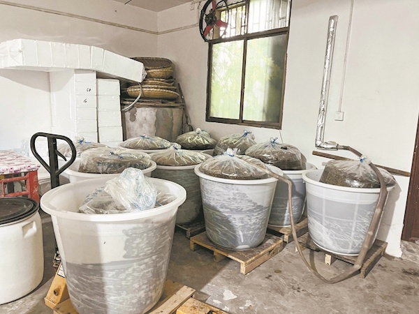 记者看到,二楼平台摆放着空腌菜缸、成捆的土瓷碗等,车间里有几大桶正在腌制的咸菜。车间里的几台冰柜上贴着纸条,写着里面存放的粉蒸肉、咸菜烧白、喜沙扣肉等产品的名称、生产日期等。