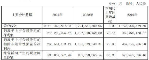 中国经济网北京4月25日讯 4月22日,神农集团(605296.SH)发布2021年年度报告。2021年,神农集团实现营业收入27.79亿元,同比增长2.02%;归属于上市公司股东的净利润2.45亿元,同比下滑78.44%;归属于上市公司股东的扣除非经常性损益的净利润2.39亿元,同比下滑79.00%;经营活动产生的现金流量净额5.86亿元,同比下滑33.86%。
