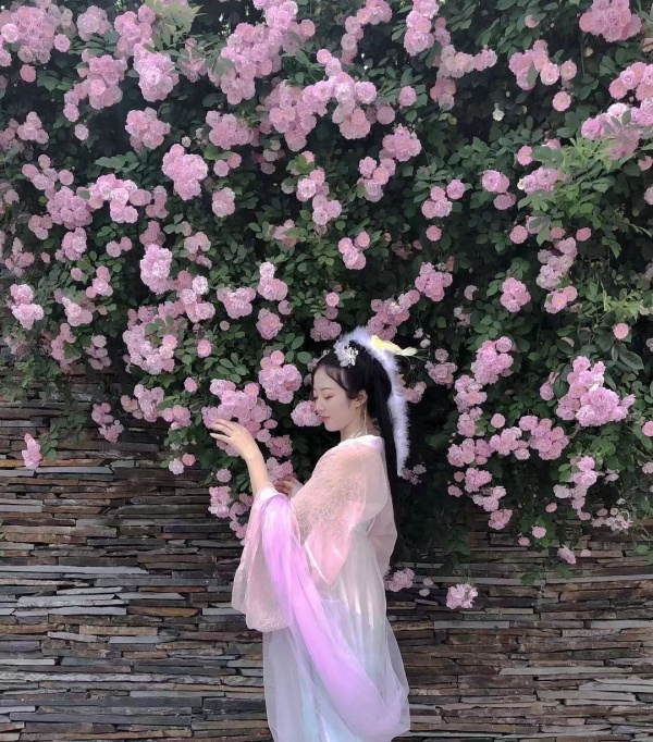 有网友着浅色系唐制汉服在蔷薇花墙前拍摄古风写真,清新淡丽,极具古典韵味。