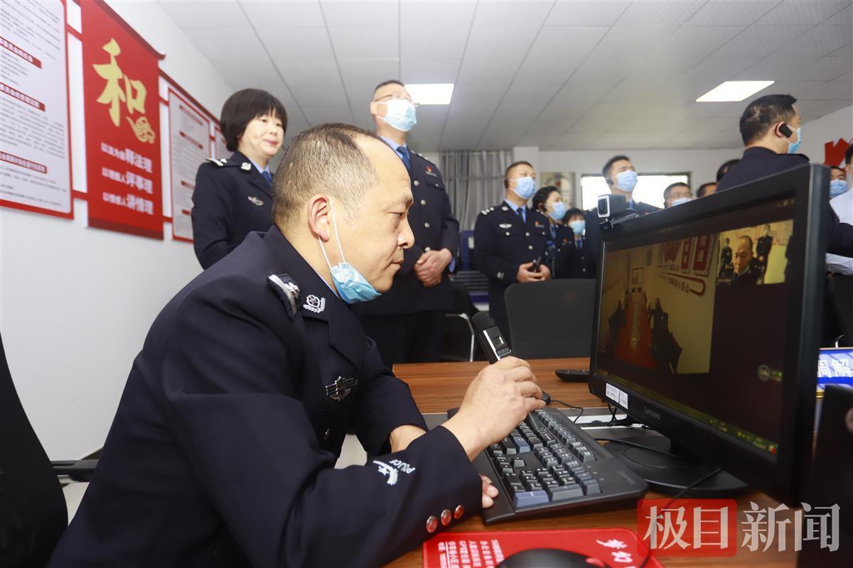 老方工作室里,一台电脑前,社区民警老方——方安峰正用方言和屏幕那边的村民耐心沟通。老方说,那头是王家井村的老乡,因为犁地的机器刮倒了乱盖的棚子,两家起了纠纷。老方曾包保该村5年,乡亲们都信他也服他。这场视频调解,只花了不到半小时就解决了。