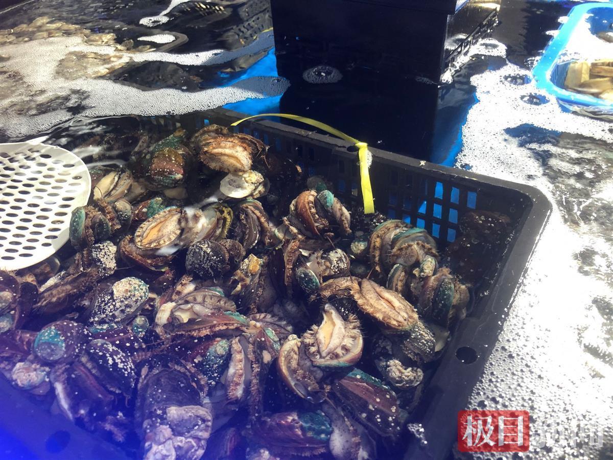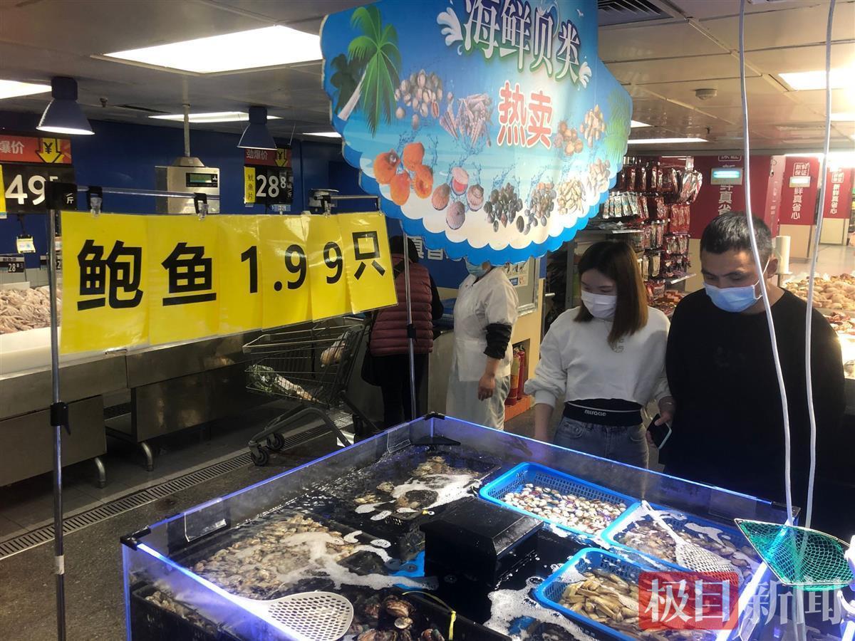 4月25日,武昌徐东的一家连锁超市里,进门处的生鲜专区,就有不少市民在挑选各类水产品和小海鲜。其中,装满鲍鱼的几个货柜前消费者最多。