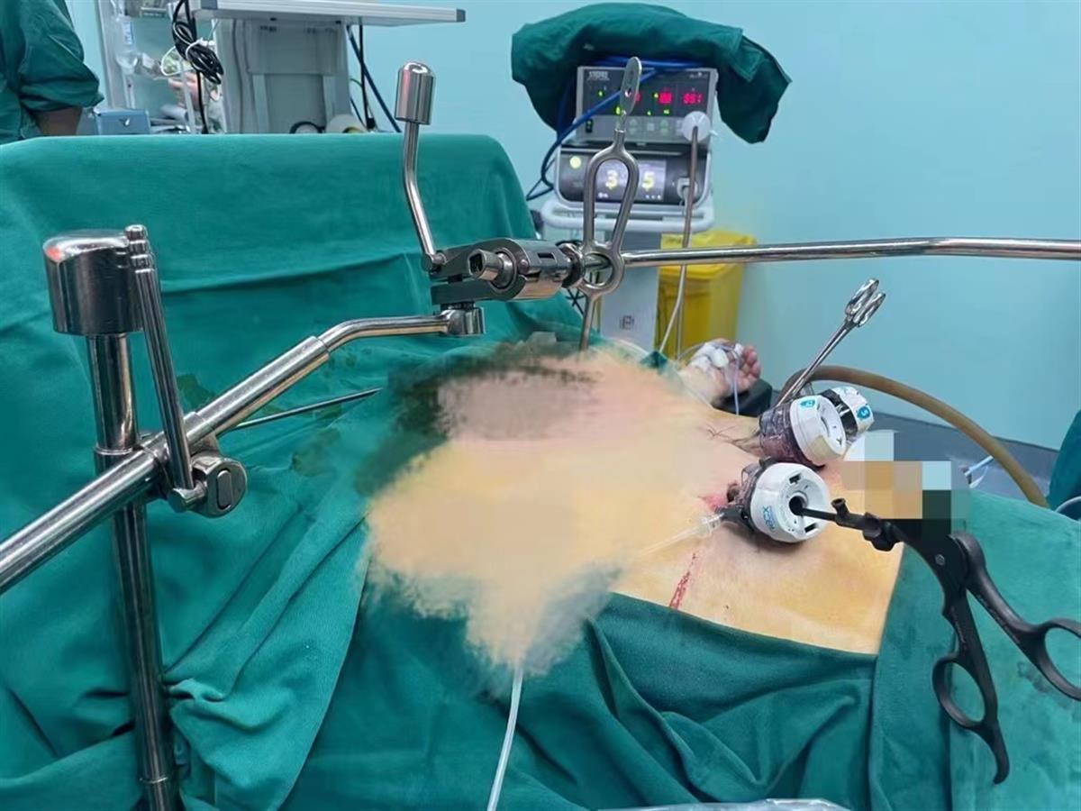 林慧庆教授带领的胸腔镜微创团队,选择剑突下径作为手术入口,从剑突下打1个1.5cm及2个0.5cm的手术孔,对双侧胸腺及纵隔脂肪做清扫,将纵隔肿瘤完整切除。术后第1天易奶奶就可以下床活动,第2天拔出胸管,并于第3天康复出院。