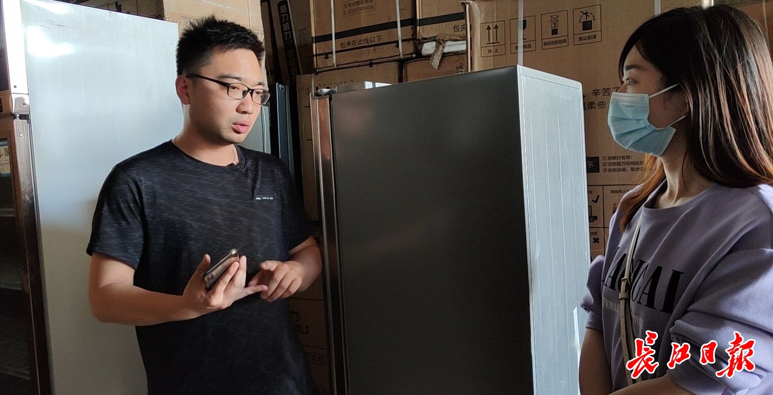 长江日报大武汉客户端4月28日讯(记者吕映雪 刘远航)“你看,这个冰箱是全新的,从工厂拿回来有些瑕疵,但功能完全没问题,不影响使用……”4月27日中午,在硚口区二手家电市场附近,一个约200平方米的仓库里,95后小伙袁週直播卖货,向客户讲解产品。当天,他这一单赚了500元。