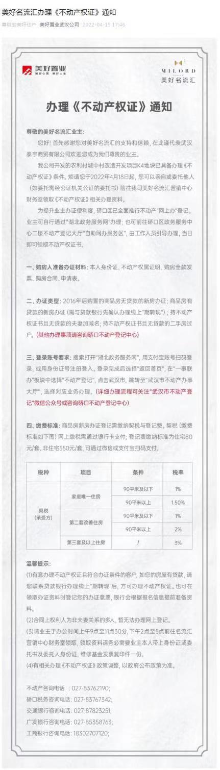武汉人李先生现在广州工作,之前,他购买了一套美好名流汇的房产。半个月前,小区开始交房,开发商告知他可以在网上办理不动产权证,他随后在业主群收到了武汉市自然资源和规划局硚口分局提供的办证指南。