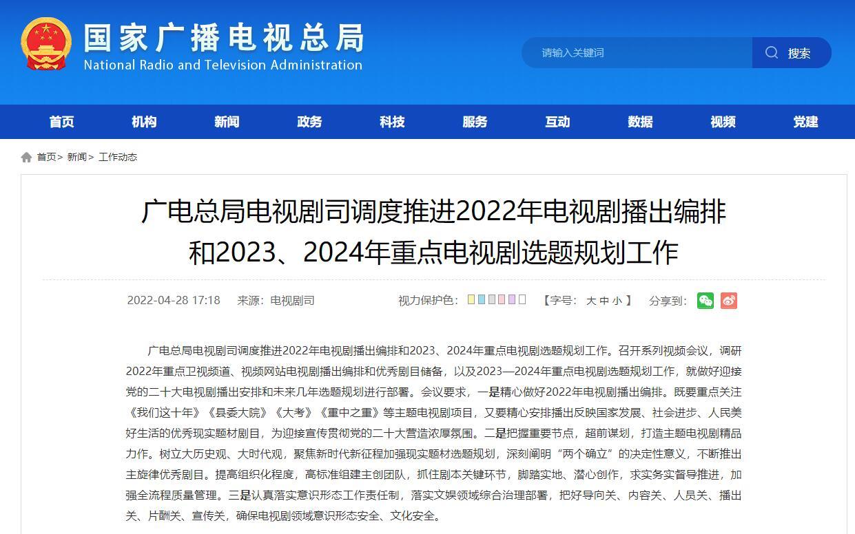 广电总局电视剧司召开系列视频会议,调研2022年重点卫视频道、视频网站电视剧播出编排和优秀剧目储备,以及2023—2024年重点电视剧选题规划工作,就做好迎接党的二十大电视剧播出安排和未来几年选题规划进行部署。