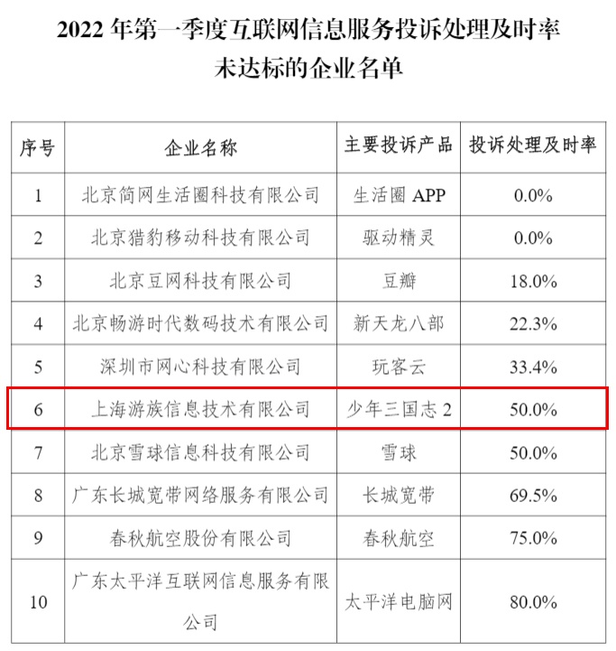 其中,上海游族信息技术有限公司登榜2022年第一季度互联网信息服务投诉处理及时率未达标的企业名单,位居第六位。其主要投诉产品为少年三国志2,投诉处理及时率为50.0%。