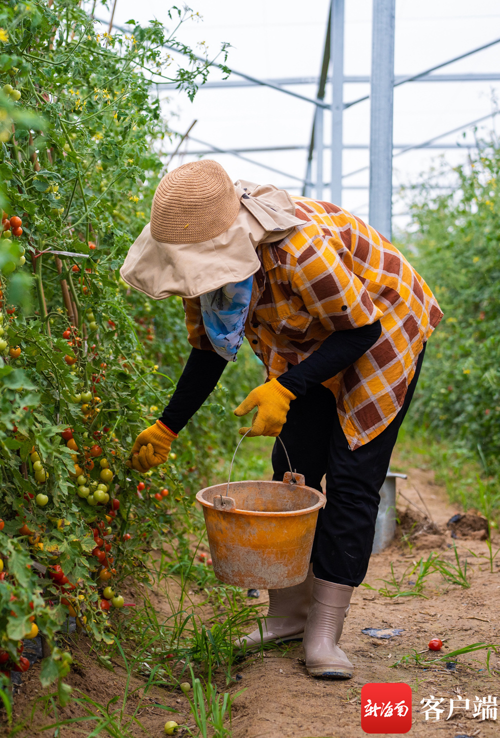 三亚市崖州区国家现代农业(种业)产业园农作物新品种新技术田间展示推广中心,工作人员在采摘小番茄。记者 李昊 实习生 朱勃羽 摄