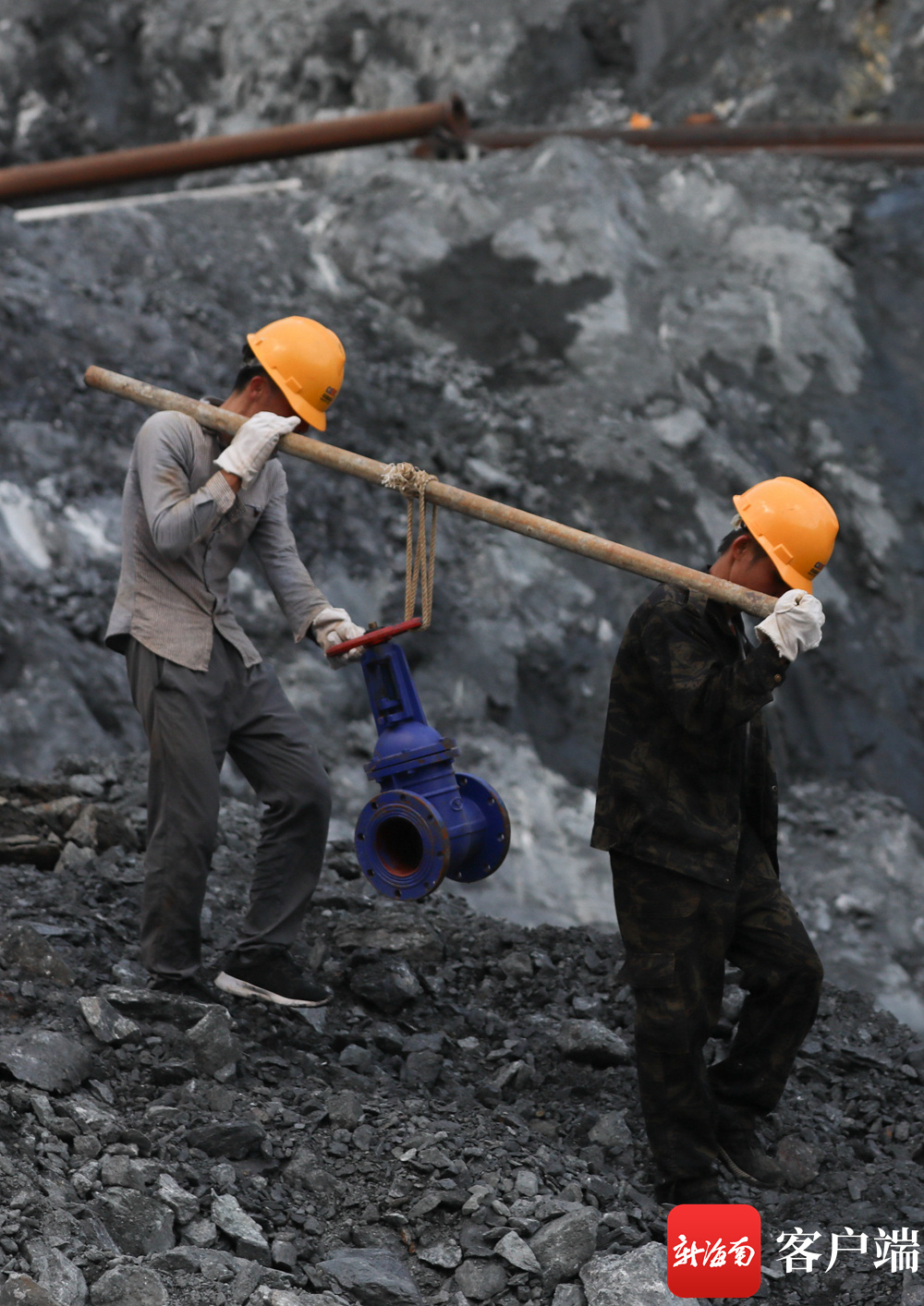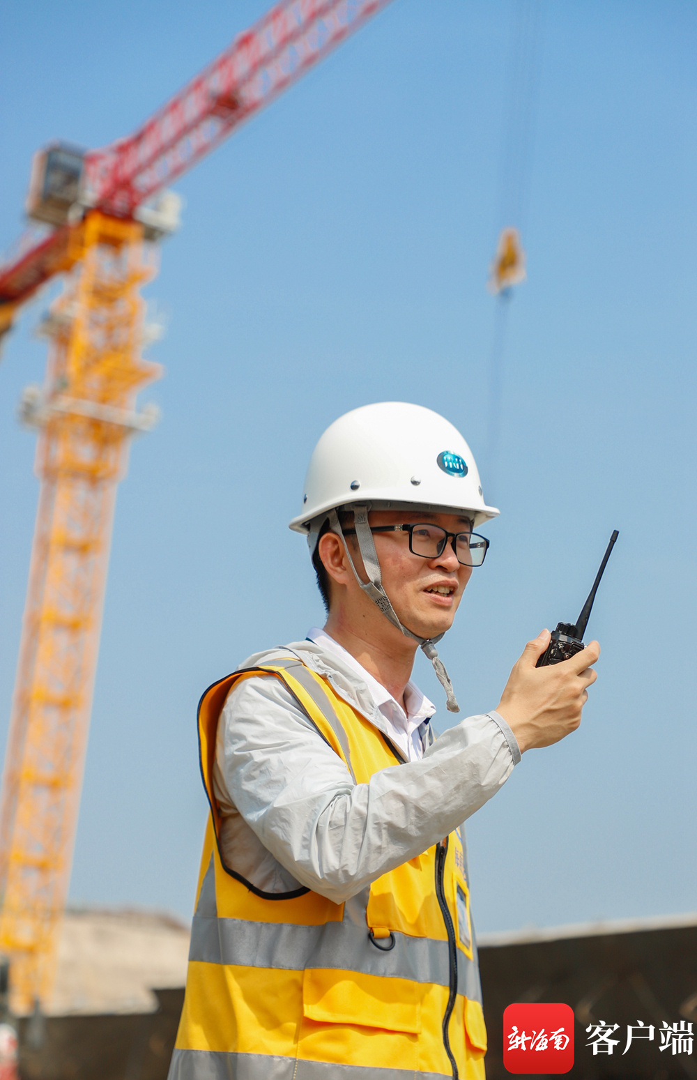海南控股天角潭水利枢纽工程建管部的工作人员在施工现场指挥作业。记者 李昊 实习生 朱勃羽 摄