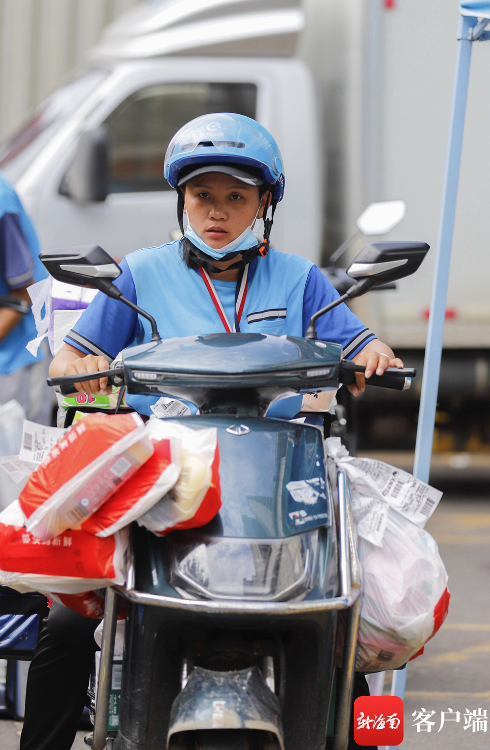 海口龙昆南路大润发超市附近,“饿了么”骑手为顾客送网上购物的物品。记者 李昊 实习生 朱勃羽 摄