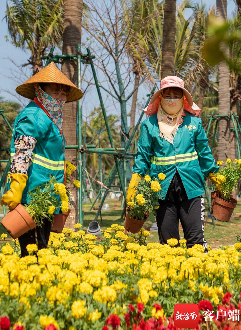 海口西海岸贯通工程项目现场,工人在摆放花坛鲜花。记者 李昊 实习生 朱勃羽 摄