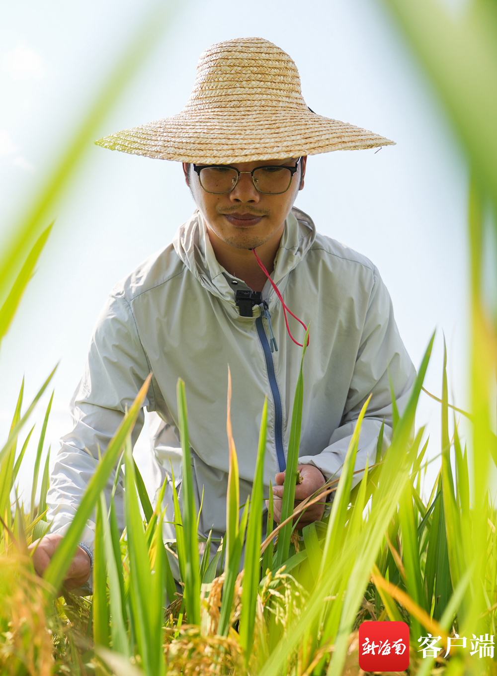 中国热带农业科学院的研究人员在定安水稻试验地块,研究水稻的生长情况。记者 李昊 实习生 朱勃羽 摄