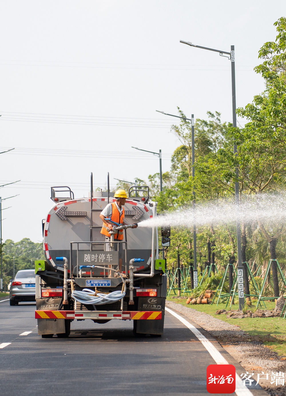 海口火山口大道拓宽工程项目现场,工作人员在为道路两旁的绿化浇水。记者 李昊 实习生 朱勃羽 摄
