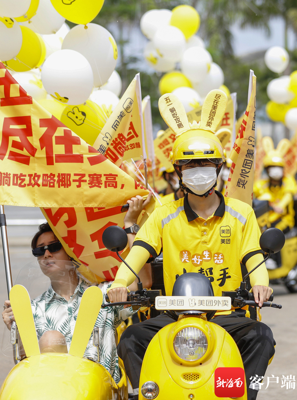 海口世纪公园附近,美团骑手排起队举行推广活动。记者 李昊 实习生 朱勃羽 摄