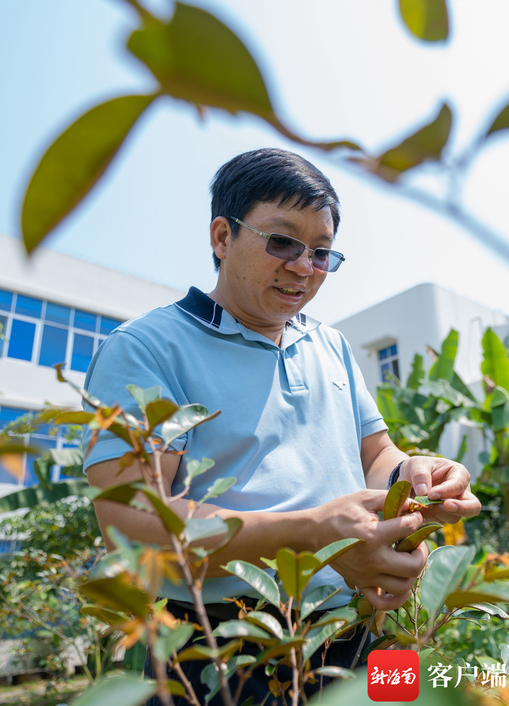中国热带农业科学院的研究人员在海口试验地块,仔细研究树叶的生长情况。记者 李昊 实习生 朱勃羽 摄