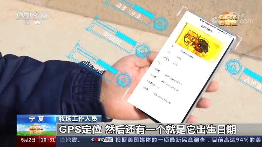 牧场工作人员:耳标号相当于就是这只羊的一个身份证号。(这只羊)当天的运动量已经达到了三万多步,还能看到实时羊只的温度(体温)、GPS定位,然后还有一个就是它的出生日期、入场重量。