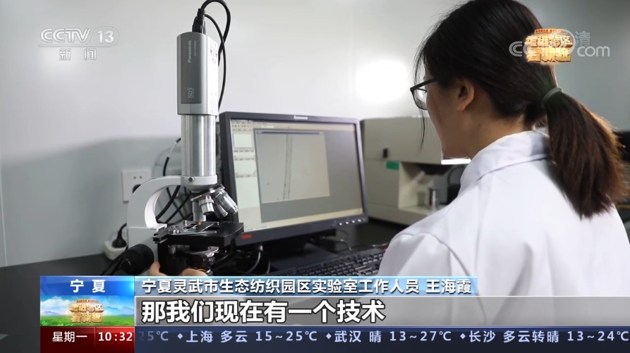 总台记者 牛巧刚:现在我们来到了灵武市纺织园区的一家实验室,这个实验室里边所有的设备都是研究羊毛羊绒的化学、物理特性的。其实一件小小的毛衣它是充满科技感的,下面我们先通过显微镜来看一下,显微镜下的羊毛是什么样子的。