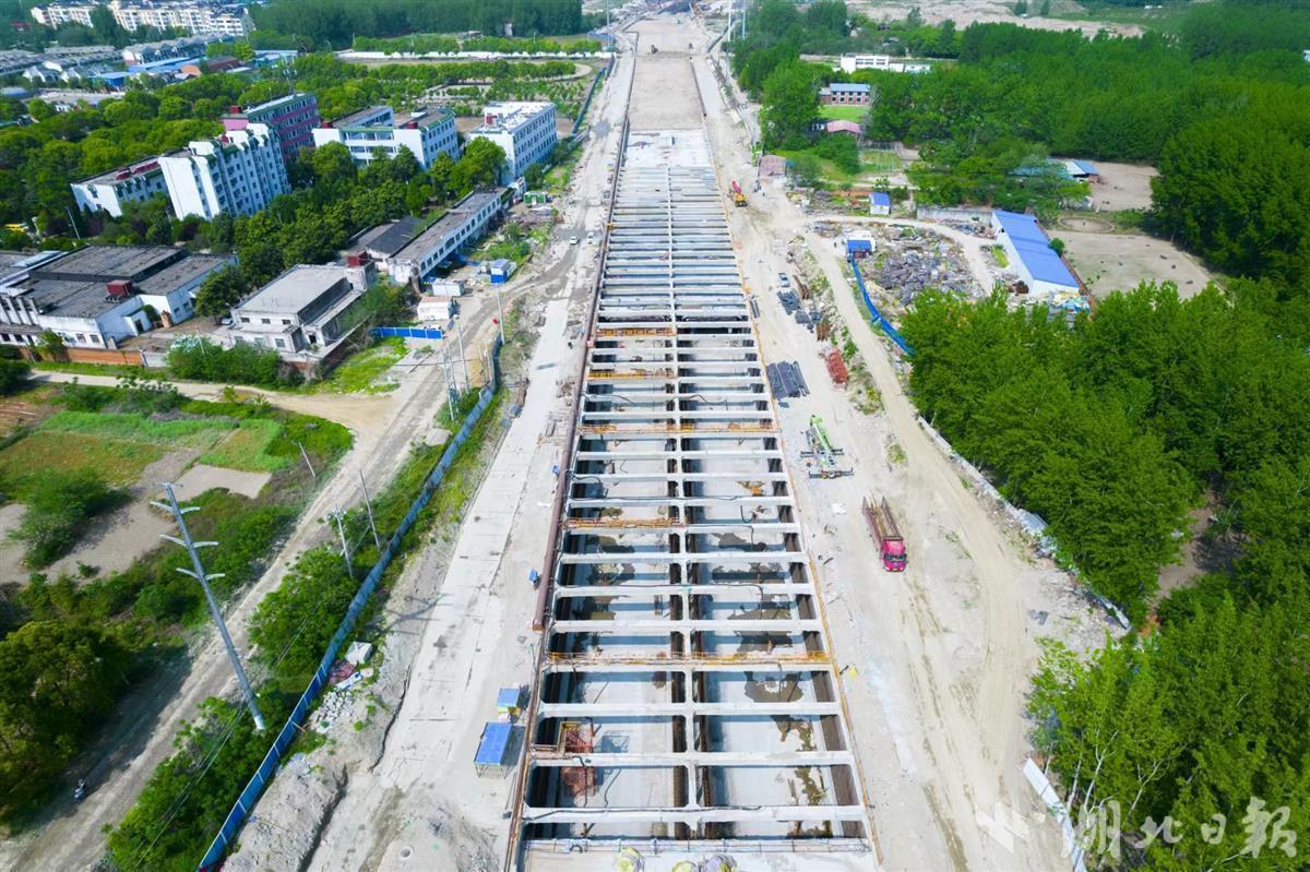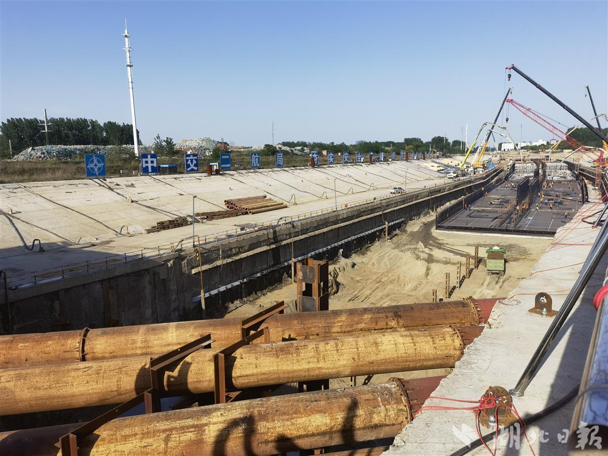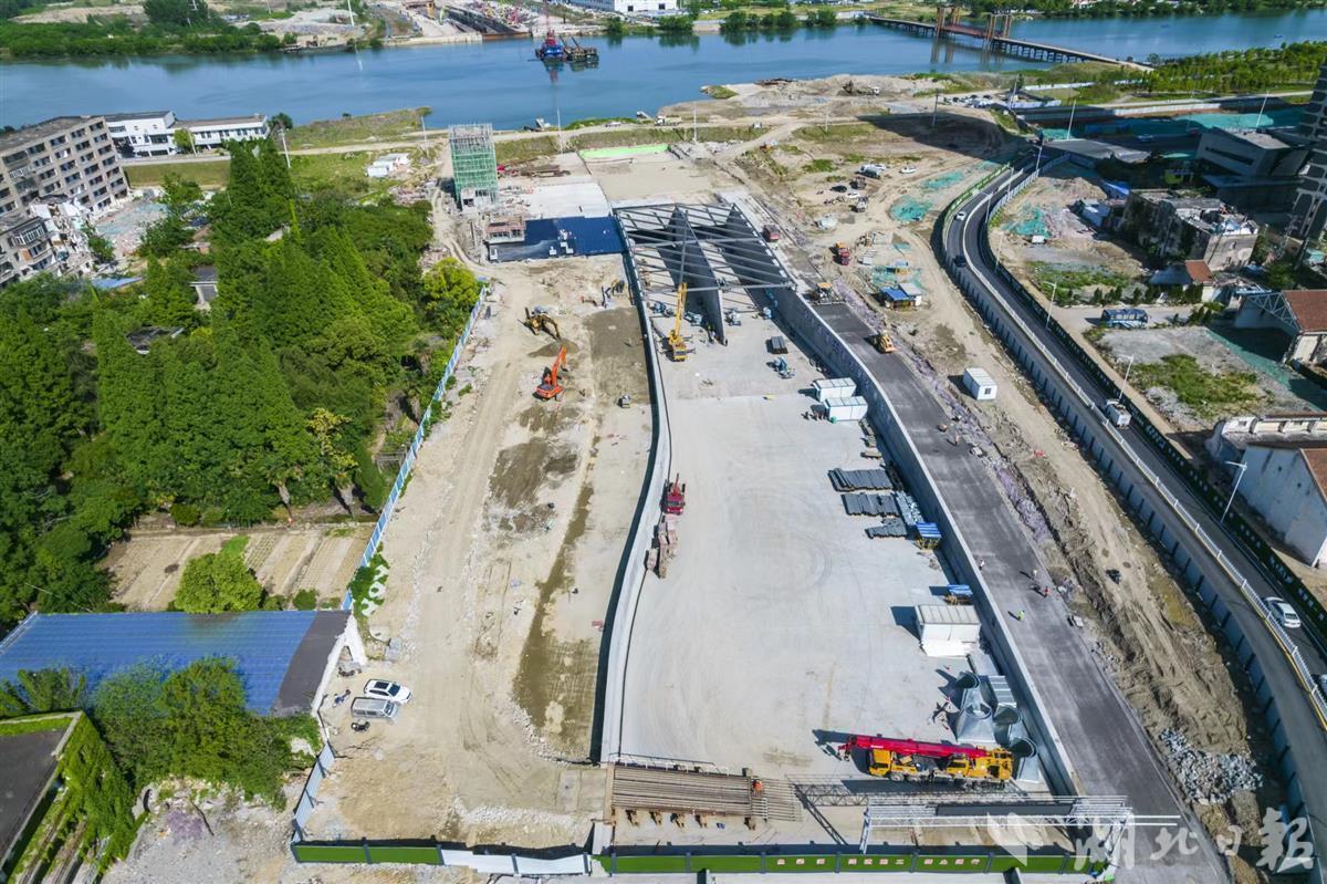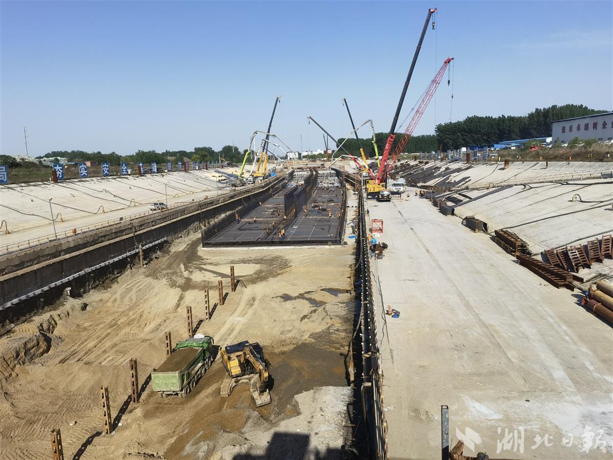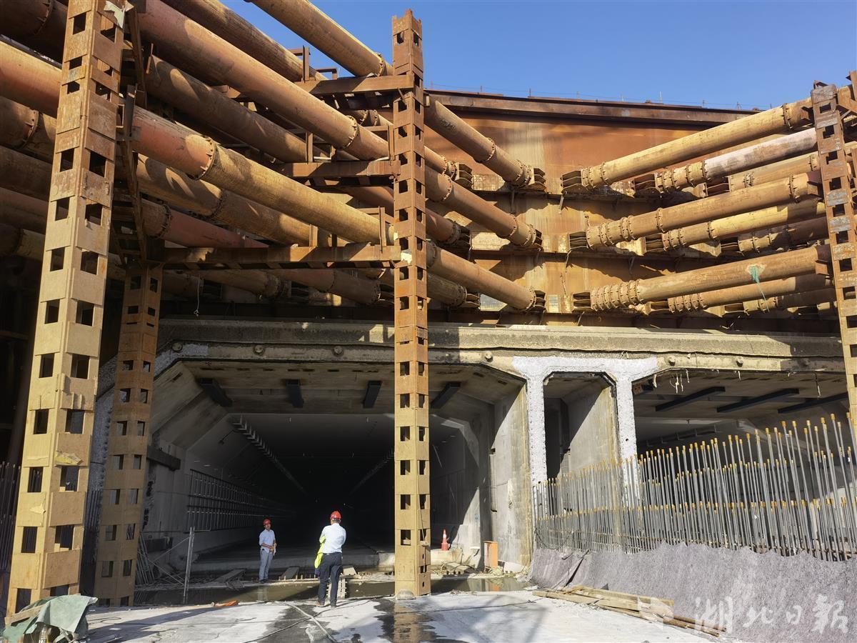 鱼梁洲西汊,400多米长、130多米宽、20多米深的“大坑”里,10台红色汽车吊轰鸣,4台天泵“突突”作响,工人们正在一片“钢筋丛林”中绑扎底板钢筋、搭设顶板支架、浇筑底板混凝土。
