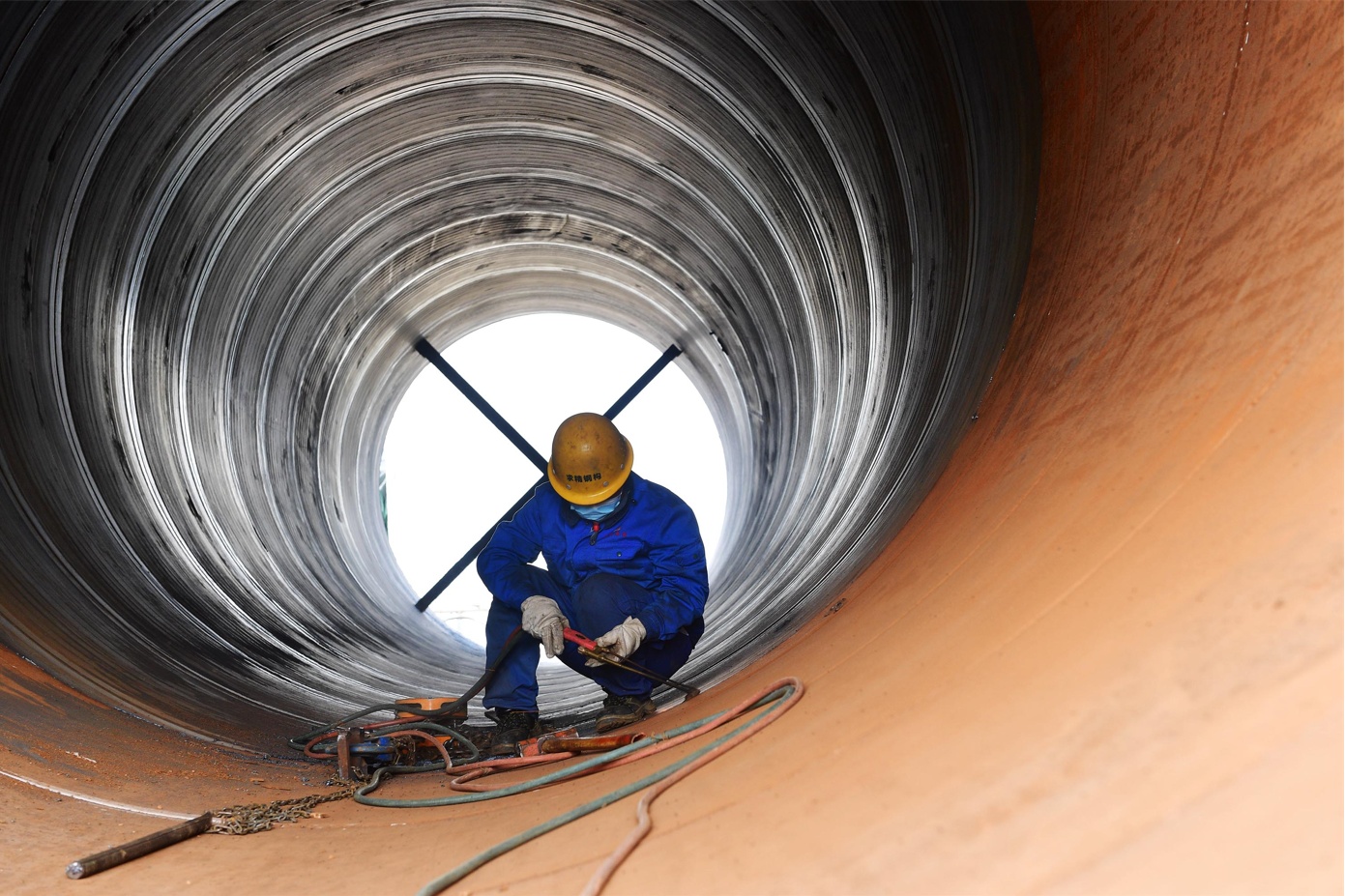 工人在直径达3.4米的钢护筒内处理钢板接缝。记者李永刚 摄