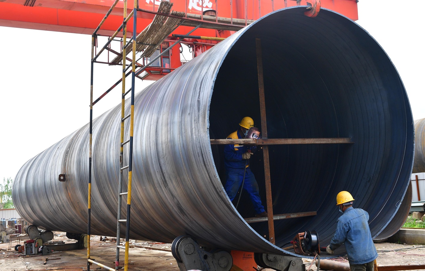 直径约3.4米的“巨型”钢护筒焊接加工接近尾声,正在等待运往港口码头,走水路前往长江中下游一座长江大桥工地。