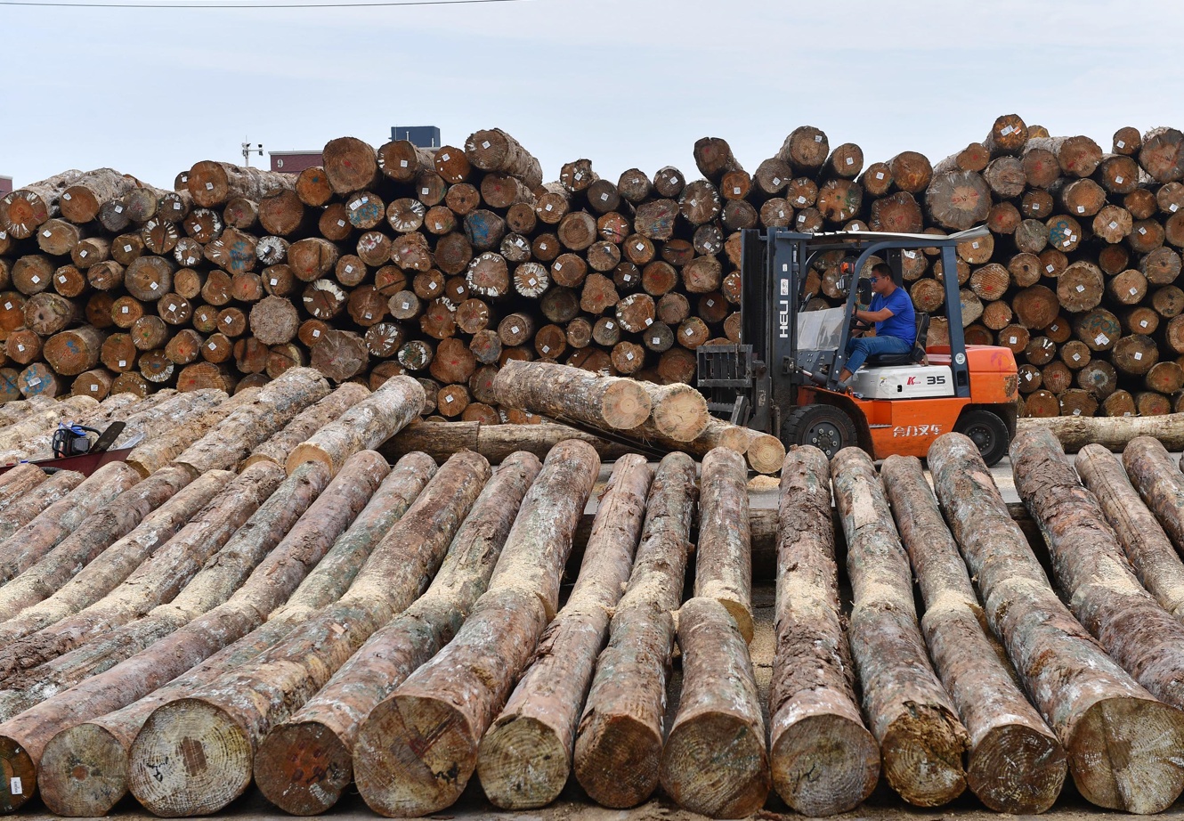 从码头转运来的原木在产业园内的木材加工厂外堆成了小山。记者李永刚 摄