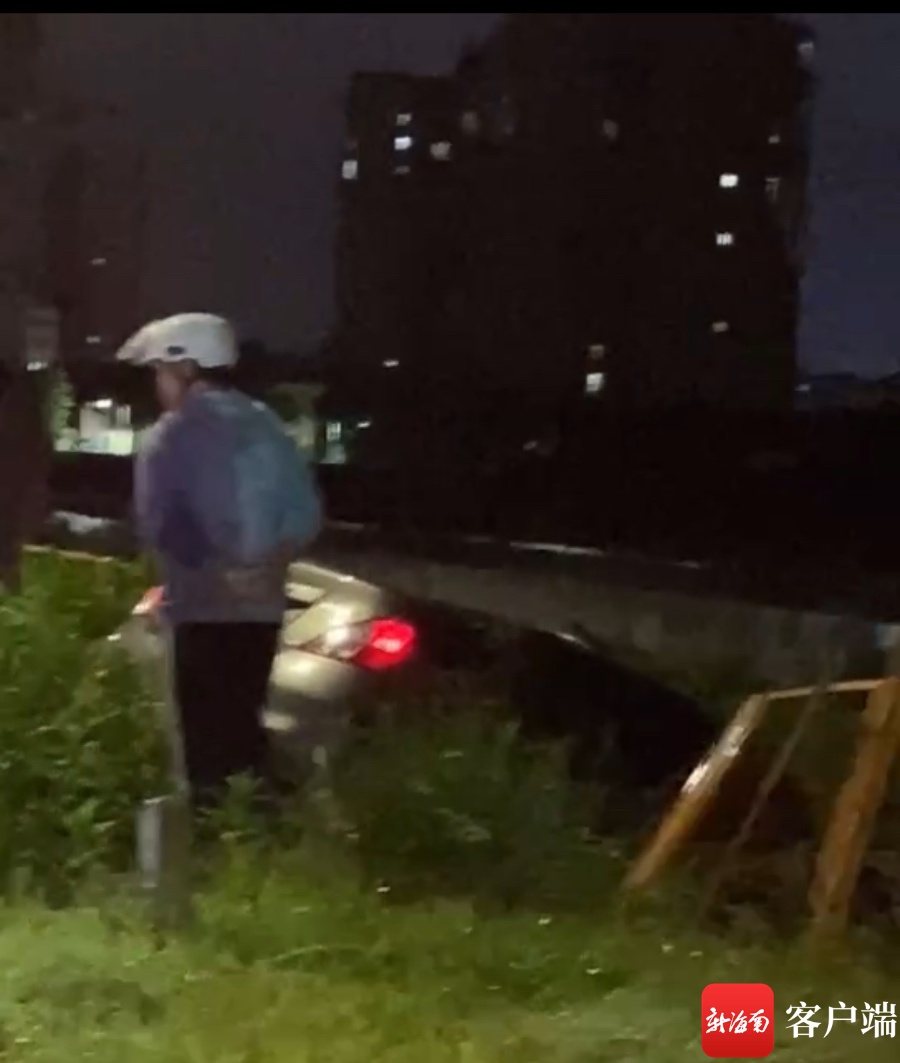 从现场视频可以看到,小轿车撞断了路边护栏,车头部位扎入灌溉沟渠里,当时正下雨。记者从现场了解到,事发前,小轿车沿着桂林洋大道行驶,当行至事发路段时,正好有一段路被积水淹没,对向也有来车。在车子打滑时司机急忙往右打方向盘,结果路面湿滑车辆失控冲到了沟里,事发后司机自己爬了上来,所幸没有受伤。