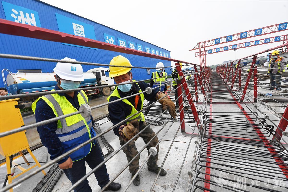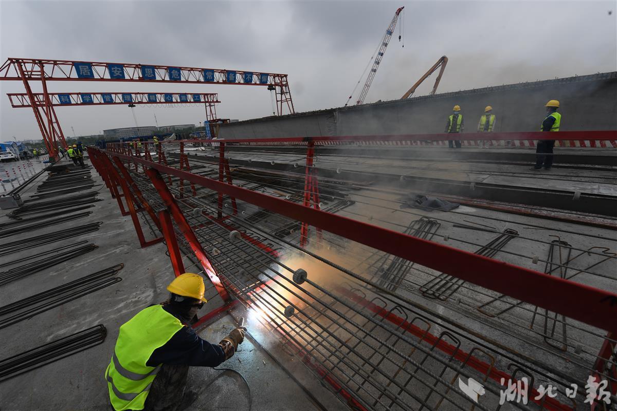 4月30日,武汉临空新城十路一桥项目现场,中建三局建设者在焊接、捆扎钢筋。该项目总投资10.41亿元,作为临空新城配套的市政道路,建成后将解决沿线居民出行,进一步完善区域路网格局。(湖北日报全媒记者田悦 通讯员周焯航 摄)