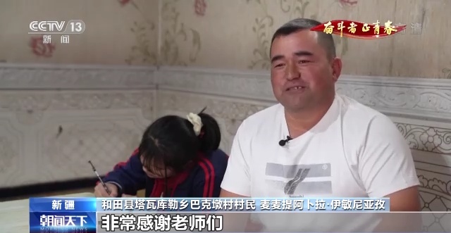 和田县塔瓦库勒乡巴克墩村村民 麦麦提阿卜拉·伊敏尼亚孜:现在孩子成绩上来了,回来都说老师有时候比我们关心她,我真不好意思的,非常感谢老师们!